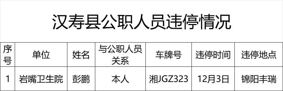 为巩固文明城市创建成果、持续营造良好的城市环境,汉寿县文明办将公职人员和单位车辆违规停放情况纳入文明创建工作考核,累计被通报5人次及以上的新申报文明单位,将取消当年申报资格,届期内文明单位予以黄牌警告;累计被通报10人次及以上的文明单位,届期内县级文明单位将直接取消荣誉,市级及以上的文明单位予以降级处理。现将2024年11月29日-12月5日公职人员和单位车辆“违章停车”情况通报如下,望广大市民和公职人员引以为戒。