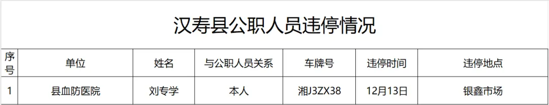 为巩固文明城市创建成果、持续营造良好的城市环境,汉寿县文明办将公职人员和单位车辆违规停放情况纳入文明创建工作考核,累计被通报5人次及以上的新申报文明单位,将取消当年申报资格,届期内文明单位予以黄牌警告;累计被通报10人次及以上的文明单位,届期内县级文明单位将直接取消荣誉,市级及以上的文明单位予以降级处理。现将2024年12月6日-12月13日公职人员和单位车辆“违章停车”情况通报如下,望广大市民和公职人员引以为戒。