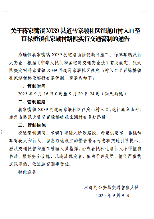 为确保蒋家嘴镇X039县道路面修复顺利施工,保障车辆及行人安全,根据《中华人民共和国道路交通安全法》有关规定,我大队决定对蒋家嘴镇X039县道马家塅社区往鹿山村入口至百禄桥镇孔家湖村路段实行交通管制。现通告如下: