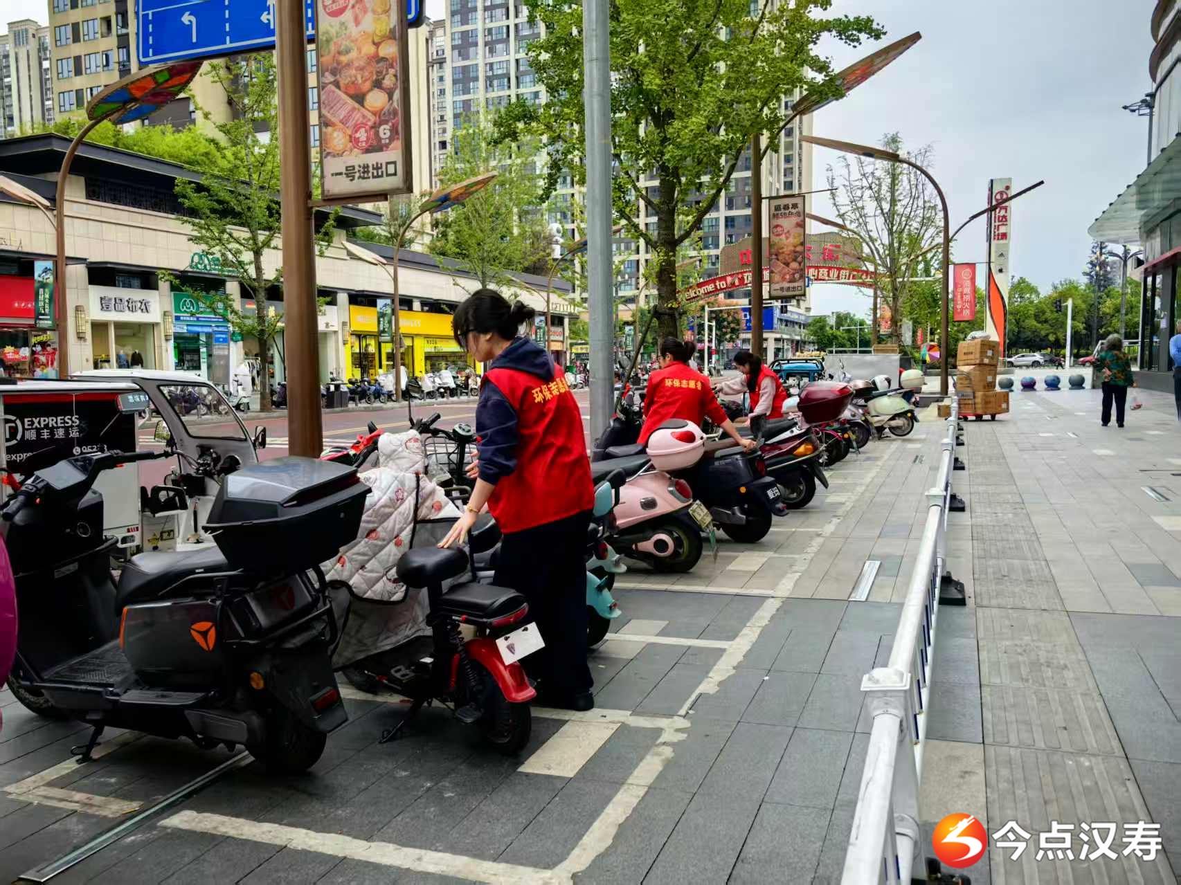 在新时代文明实践中心环境保护志愿服务活动中,来自县城管执法局的志愿者们发挥专业特长,对城区机动车辆乱停乱靠,电动车、摩托车、停靠杂乱无序等问题进行劝导,并将万达广场周边乱停乱放的电动车,推入、导入规范的停车位内,营造了整洁、有序、文明的城市环境。