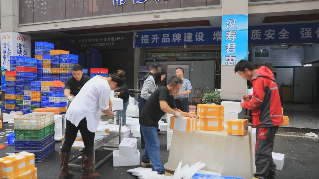 在紧邻旁边的这家门店,工人们也正忙着下货、装箱、发货。门店负责人告诉记者,这些甲鱼尽管刚刚从塘里捕获回来,但是每只甲鱼的袋子上都贴上了客户单号,已经“名花有主”。原来,跟随着电商直播的热潮,公司近年来通过直播镜头与网友、商户无缝对接,同时采用“专业电商公司+农户”的合作模式进行线上直播销售,通过网络平台宣传推介优质的汉寿甲鱼。甲鱼从塘里捕获后,客户通过现场直播平台拍照下单,实现即卖即打包,从基地直达客户手中。
