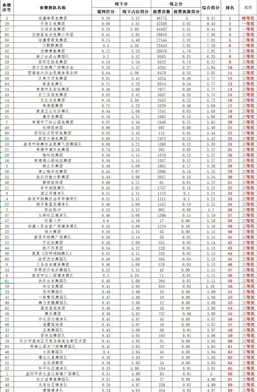根据组委会评分规则,比赛成绩由线下专业评委评分和线上网络投票两部分组成。10月4日上午8时至10月7日18时,在常德日报微信公众号开启网络投票,经统计累计投出33万余张有效票。现将参赛队伍的得分及排名情况公布如下: