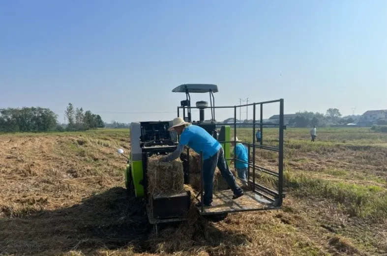 现场会上,技术员操作秸秆打捆机,沿着收割后的田埂缓缓前行。机器前端的捡拾器将散落的秸秆“吞”进机身,经过压缩、打结,短短几分钟就形成一捆紧实的秸秆,这些秸秆将被回收利用,变废为宝。