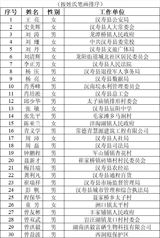 根据《常德市人民建议征集工作实施细则(试行)》(常社发〔20252号)和《汉寿县人民建议特邀建议人制度(试行)》相关规定,经个人自荐、单位推荐和资格审核、综合评议等程序,拟聘用以下30名人民建议特邀建议人,现予以公示。