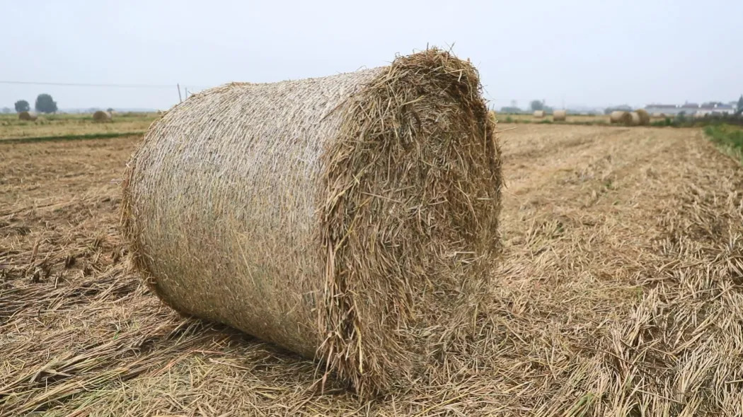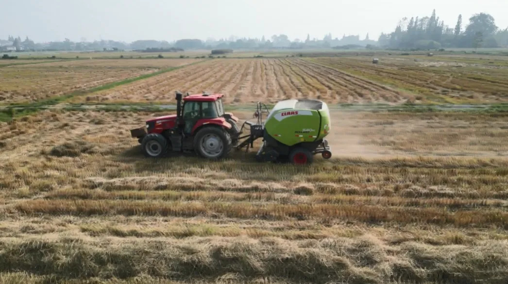 在汉寿县酉港镇富扬村这片刚刚收割后的稻田里,种粮大户熊耀华正在调度机械设备进行秸秆离田作业。随着两台8盘牵引式搂草机轰鸣作业,散铺在地面上的稻草立即被搂集成行。随后,大型圆滚打包机驶来,成行的稻草瞬间被吸走,随着旋转、压实、打捆,变成了黄橙橙的圆柱形稻草秸秆包,整齐码放在田间,田间地头立刻变得干净整洁。