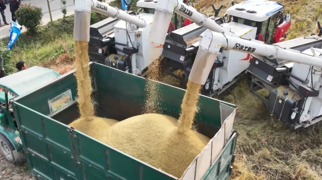 汉寿县酉港镇神凤村种粮大户 熊耀华:这个是秸秆打包离田,我每天包括转运的机械有40至50台。