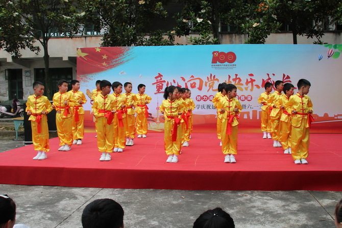 6月1日上午,汉寿县沧港镇金龙小学全体学生戴着鲜艳的红领巾,或着红衫白裙,或穿白衫蓝裙,或着红军服装,在校园的舞台上载歌载舞,用歌声、舞蹈和朗诵等形式庆祝“六一”儿童节、庆祝建党100周年。孩子们的爸爸妈妈、爷爷奶奶、叔叔阿姨也纷纷前来助阵庆贺,校园里热闹非凡。