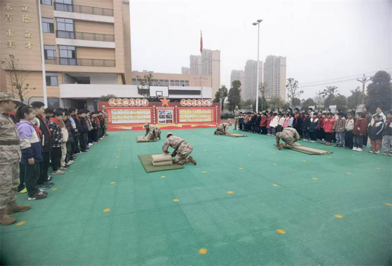 喜报进校园榜样励童心。上午 9时,活动在铿锵有力的口号声中拉开帷幕。8名新兵教官迈着整齐的步伐、喊着嘹亮的口号登场,进行队列科目展示。摆臂划一、步伐铿锵、身姿挺拔,教官们标准的动作、严谨的作风、昂扬的精神风貌,让现场师生们目不转睛,每一个整齐的队列变换,都赢得了同学们阵阵热烈的掌声。
