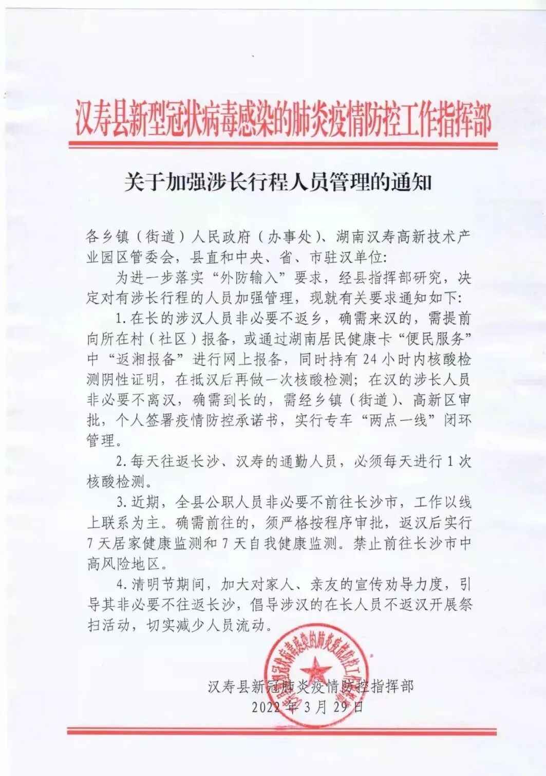 二是严格落实防疫政策,及时主动报备报告。严格执行国家及省市有关防疫政策要求,所有入(返)湘人员需持48小时内核酸检测阴性证明入湘,并在抵湘后第一时间进行报备,了解当地的防疫要求,并配合做好各项防控工作。严格落实测温、扫场所码、核验健康码、通风消毒、督促戴口罩等防控措施,加强人流引导,避免人员聚集。