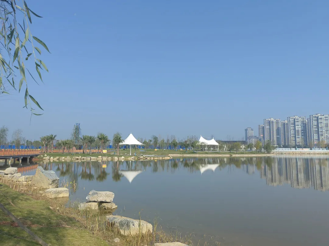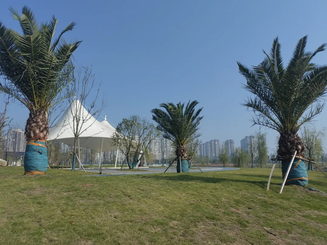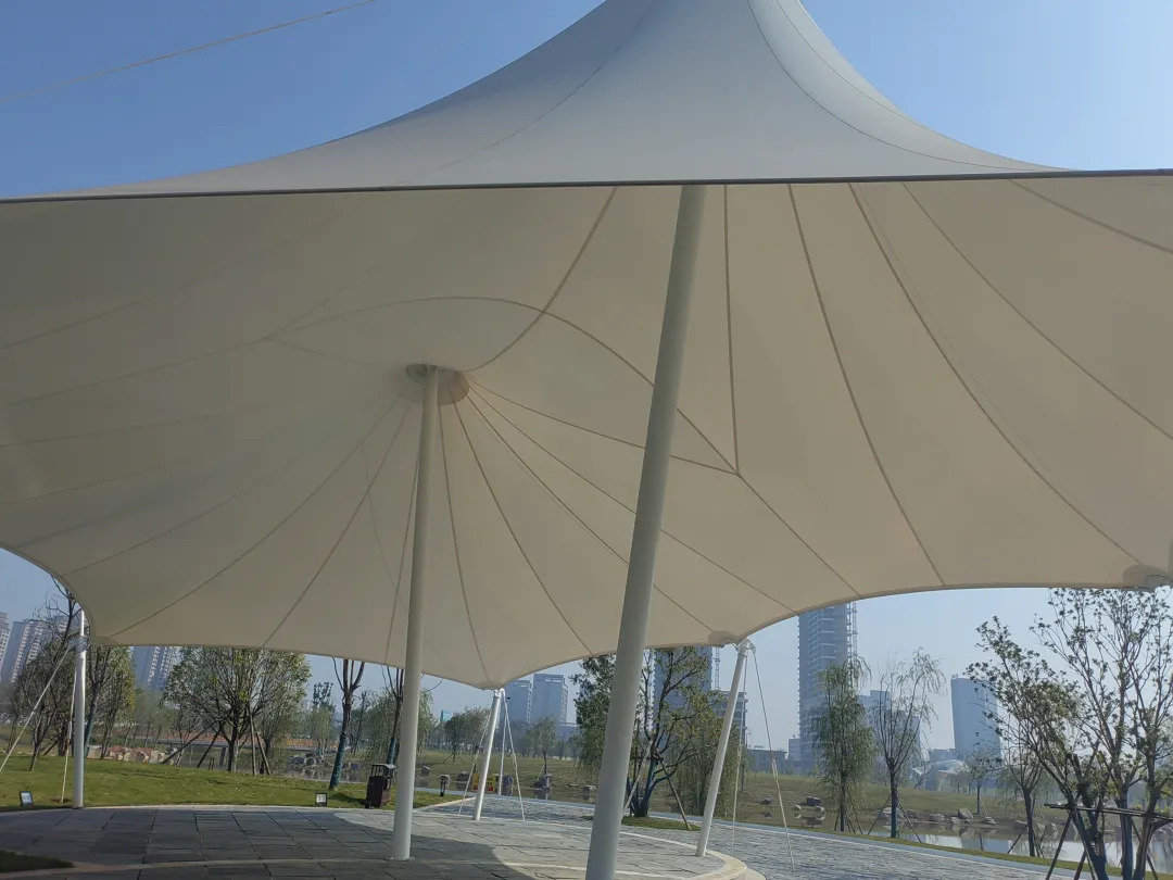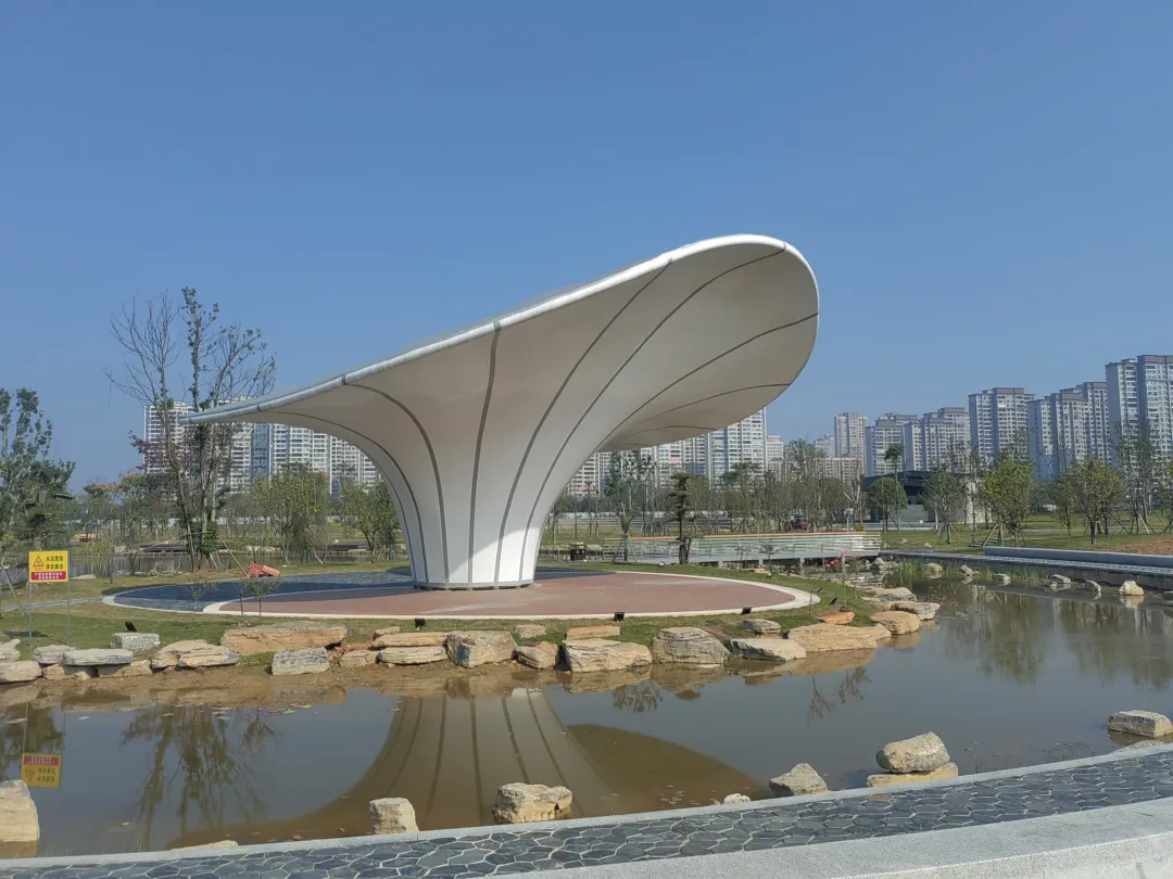 点缀在水畔、草坪和绿树间的阳雨棚造型别致。有的像草地上雨后长出来的伞菌,有的像水中喷起的浪花,还有的像航行中扯起的船帆……为公园平添了许许多多的妆容与灵动。