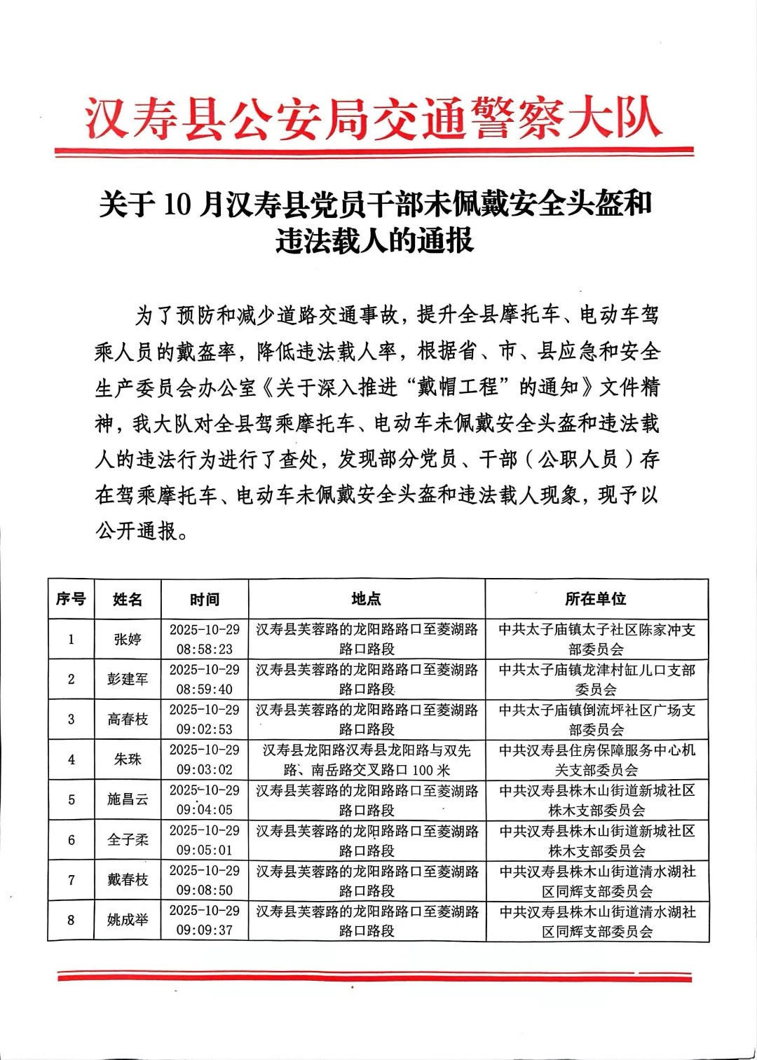 希望各相关单位根据文件精神,进一步强化宣传教育,全县党员、干部(公职人员)要自觉遵守道路交通安全法律法规,养成文明出行,安全出行的良好习惯,做到驾乘摩托车、电动车佩戴安全头盔,不非法加装伞具,驾乘机动车主动礼让行人,争当文明出行,安全出行的排头兵,并宣传引导身边人,提升文明素质,提高安全意识。