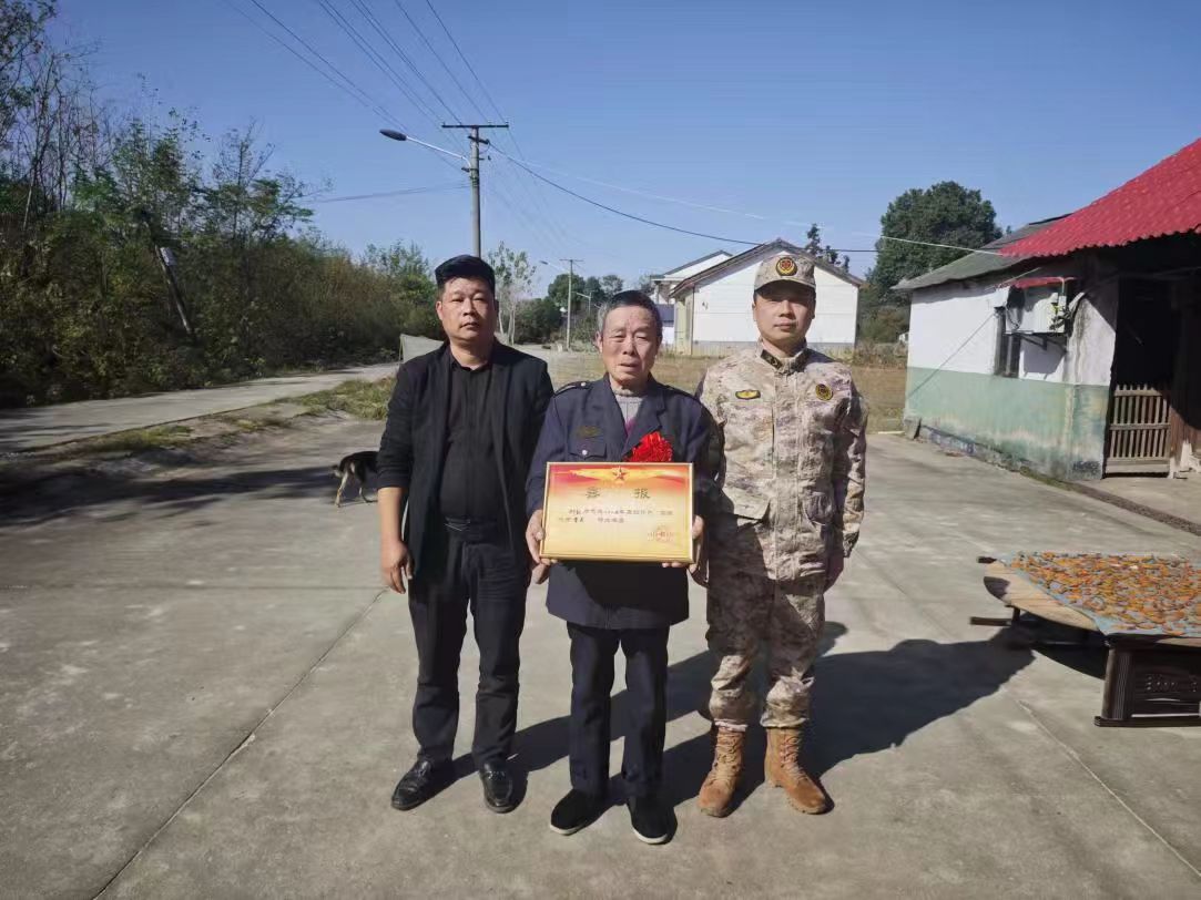 工作人员在村干部的带领下,来到镇里受奖军校学员家中,一边为学员的爷爷佩戴胸花,一边说道:“您的孙子在军校表现优异,被评为了‘优秀学员’,这不仅是孩子的荣耀,更是我们镇的骄傲。”