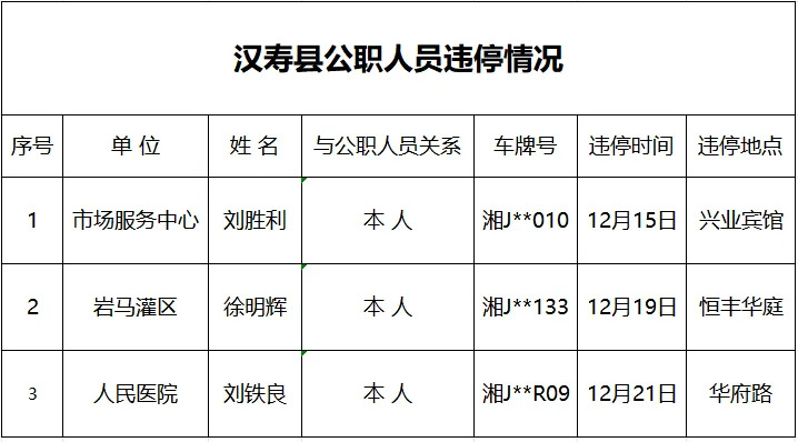 按照县委、县政府建设社会主义现代化新汉寿的目标要求,当前,汉寿人民正齐心协力投身于综合秩序整治行动中,城市总体文明风貌得到明显提升。但仍有少数公职人员未起到表率作用,未在规定区域内停车。为巩固文明城市创建成果、持续营造良好的城市环境,县文明办将持续通报公职人员和单位车辆违规停放情况,望广大市民和公职人员引以为戒。现将2025年12月15日-22日公职人员和单位车辆“违章停车”情况通报如下。