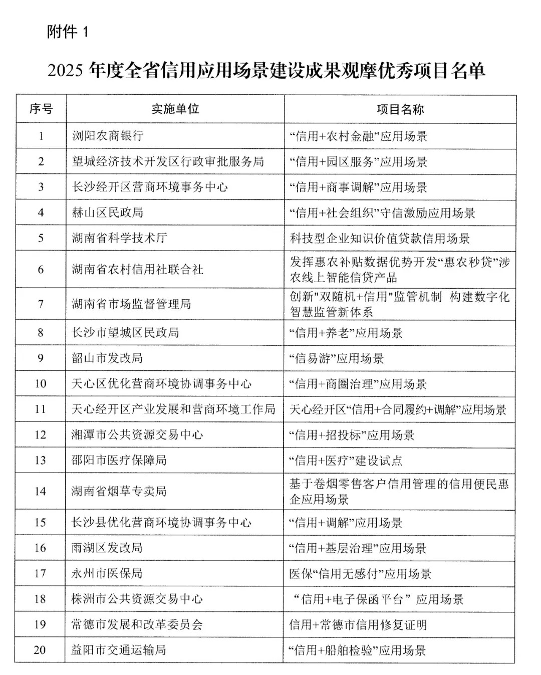 1月4日,湖南省健全社会信用体系联席会议办公室公布2025年度全省信用应用场景建设成果观摩活动结果。经过两轮专家评审和综合审议,活动共评选出25个优秀项目和50个特色项目,常德市共有5个项目入选。汉寿榜上有名: