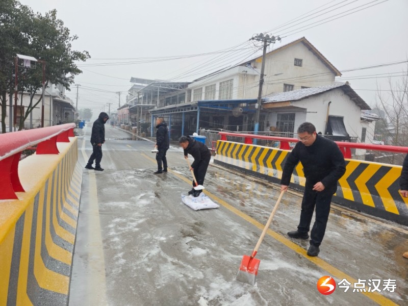 党员干部和志愿者分工协作、默契配合,手持铁锹铲除桥面顽固积冰,并沿着桥面两侧有序撒放融雪盐,确保均匀覆盖每一个区域,加速冰层融化,同时抑制新冰形成,为过往车辆和行人开辟出一条安全通道。