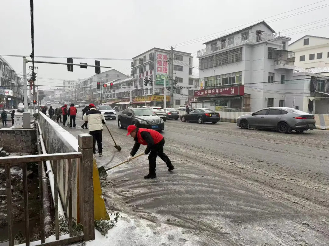 1月20日,崔家桥镇迅速启动应急响应,全力开展冰雪应对工作,重点巡查主要交通干道、桥梁、陡坡及集镇市场等关键区域。在结冰隐患较大的路段,工作人员利用铁锹、扫帚等工具清除路面积雪,有序开展撒盐除冰作业。在重要路口安排人员值守引导,提醒过往车辆谨慎驾驶,确保出行安全。