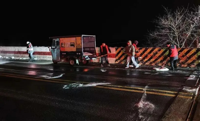 1月20日,毛家滩回维乡动员组织16个村(社区),调动机械装备对319国道、沧毛公路、黄岩公路及各村(社区)主干道开展除冰行动。党员干部在319国道沿线已疏通路段、桥梁、陡坡等重点区域进行安全巡查、提前撒盐,预防夜间道路结冰,保障全乡主干道畅通。