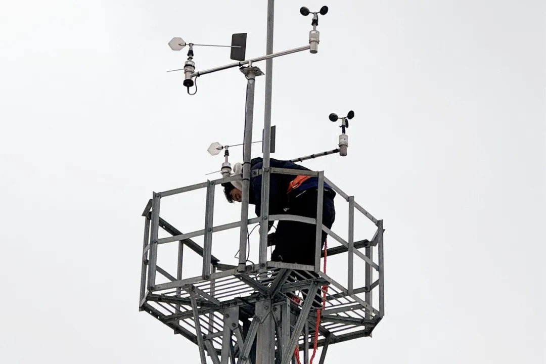 党员干部顶着凛冽寒风攀爬覆冰铁塔,系牢安全绳,在高空仔细清理传感器积冰、检查轴承灵活性,紧固信号接口;同事默契配合,传递工具、实时监测设备状态。