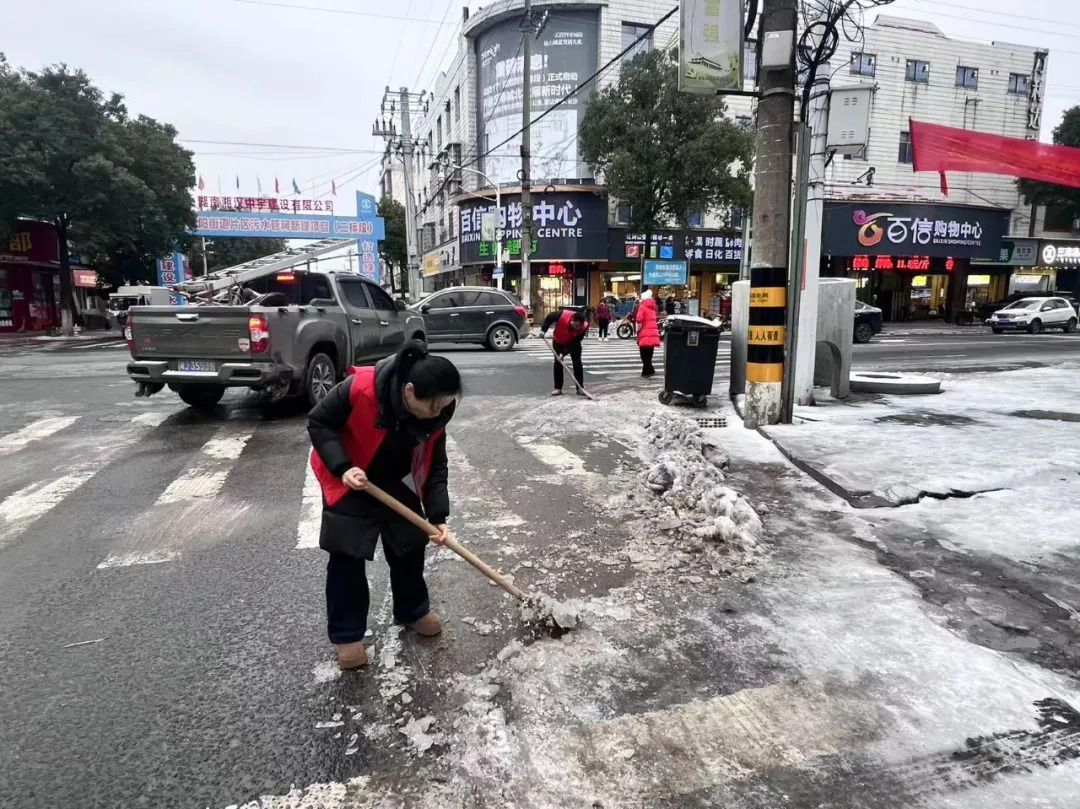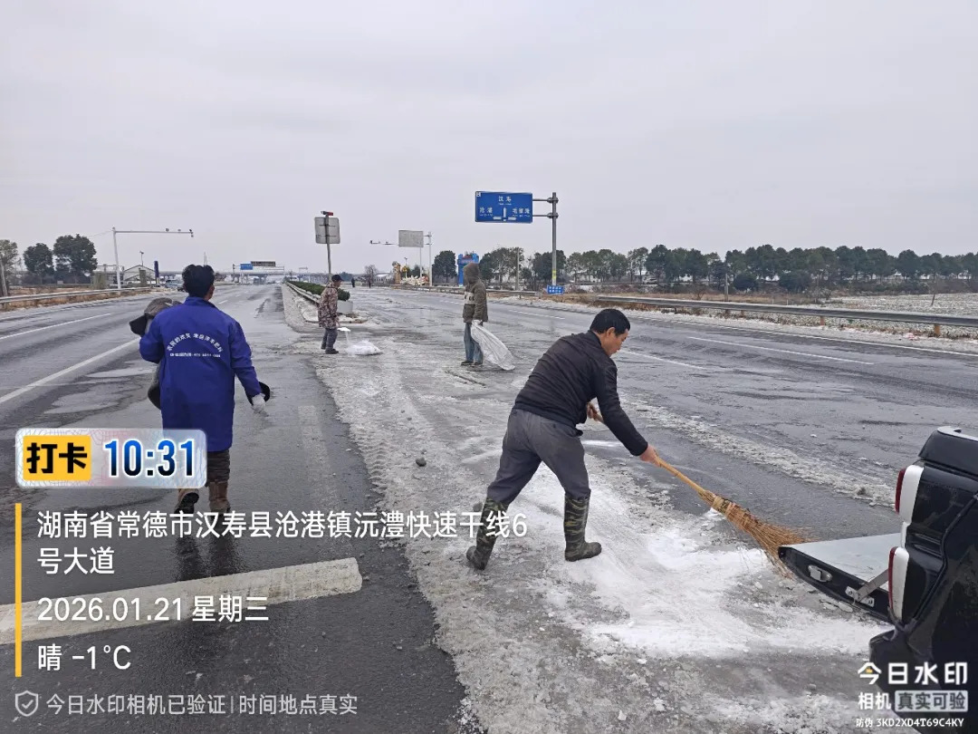 1月21日,沧港镇组织力量在汉德大道通过人机结合方式加快除冰除雪,并劝导沿线商贩注意安全;同时,对沅水一线大堤穿堤建筑物及涉水道路开展专项巡查,排查隐患,切实保障道路与堤防安全。