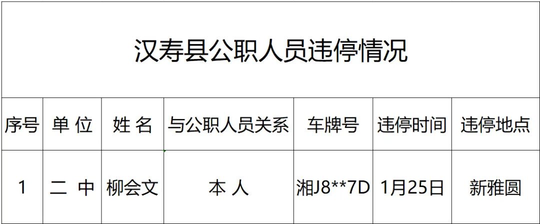 按照县委、县政府建设社会主义现代化新汉寿的目标要求,当前,汉寿人民正齐心协力投身于综合秩序整治行动中,城市总体文明风貌得到明显提升。但仍有少数公职人员未起到表率作用,未在规定区域内停车。为巩固文明城市创建成果、持续营造良好的城市环境,县文明办将持续通报公职人员和单位车辆违规停放情况,望广大市民和公职人员引以为戒。现将2026年1月16日-27日公职人员和单位车辆“违章停车”情况通报如下。