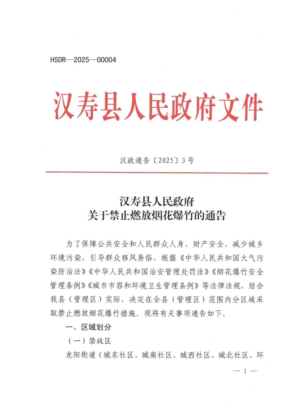 全县范围内禁放区以外的其他区域;西湖管理区除禁放区以外的区域。禁止任何单位和个人在该区域内燃放烟花爆竹。对违反本通告规定,在禁放区燃放烟花爆竹的,由公安机关责令停止燃放,构成违反《烟花爆竹安全管理条例》和《中华人民共和国治安管理处罚法》的,由公安机关依法给予治安管理处罚。禁止任何单位和个人在该区域内燃放升空类烟花爆竹。对违反本通告规定,在限放区燃放升空类烟花爆竹的,由公安机关责令停止燃放;构成违反《烟花爆竹安全管理条例》和《中华人民共和国治安管理处罚法》的,由公安机关依法给予治安管理处罚。(一)县(管理区)公安、应急管理、城管执法、交通运输、市场监管、市生态环境局汉寿分局、西湖管理区管理委员会等部门要切实履行职责,加强宣传,紧密协作。(二)家长、学校应当教育未成年人不得在禁放区内燃放烟花爆竹,燃放烟花爆竹不得损害公共安全和人民群众人身、财产安全。未成年人的监护人未履行监护职责的,依法承担相应责任。(三)任何单位和个人都有权制止和举报在禁放区内非法燃放烟花爆竹的行为。对打击报复举报人、制止人的,依法从重处罚。举报电话:0736-2337989(禁放区);0736-2862883(限放区);0736-2823495(西湖管理区管理委员会)。本通告自发布之日起施行,有效期三年。原《汉寿县人民政府关于禁止燃放烟花爆竹的通告》(汉政通告〔2024〕1 号)同时废止。
