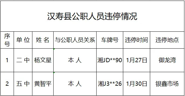 按照县委、县政府建设社会主义现代化新汉寿的目标要求,当前,汉寿人民正齐心协力投身于综合秩序整治行动中,城市总体文明风貌得到明显提升。但仍有少数公职人员未起到表率作用,未在规定区域内停车。为巩固文明城市创建成果、持续营造良好的城市环境,县文明办将持续通报公职人员和单位车辆违规停放情况,望广大市民和公职人员引以为戒。现将2026年1月27日-2月3日公职人员和单位车辆“违章停车”情况通报如下。