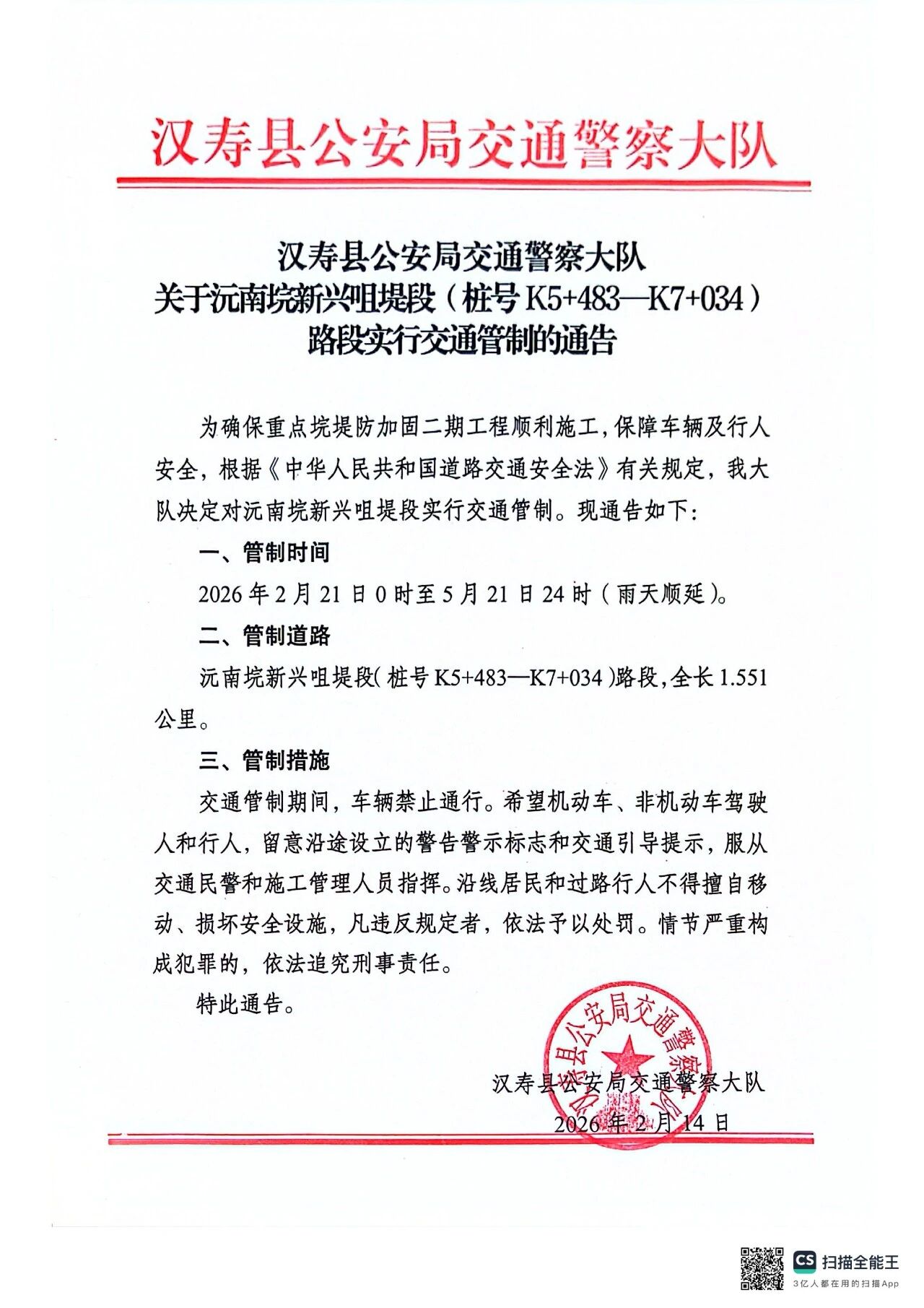 汉寿县公安局交通警察大队 关于沅南垸新兴咀堤段(桩号K5+483—K7+034)路段实行交通管制的通告