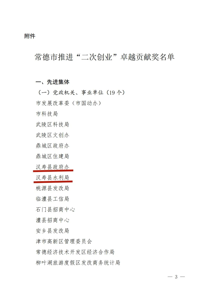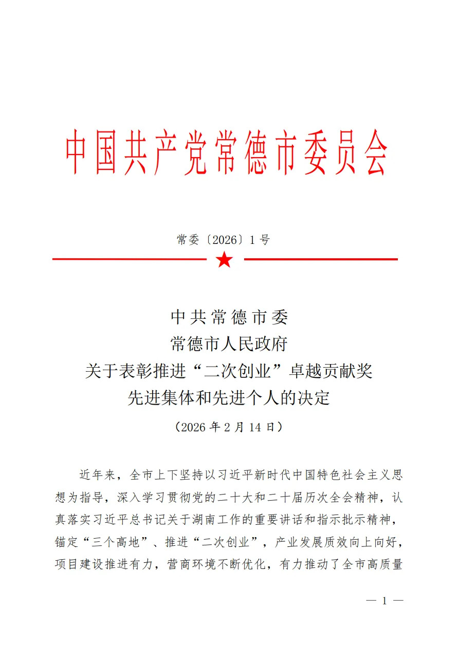 近日,中国共产党常德市委员会发布《中共常德市委 常德市人民政府关于表彰推进“二次创业”卓越贡献奖先进集体和先进个人的决定》(常委〔2026〕1号),对在全市推进“二次创业”中作出卓越贡献的先进集体和先进个人予以表彰。其中,汉寿县共有7个集体和6名个人荣获表彰。