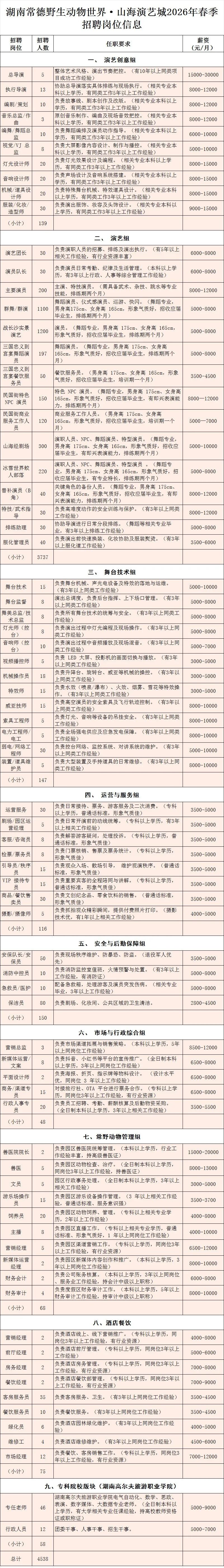 为深入推进常德文旅融合发展,持续丰富夜间文旅消费新场景,2026 年将全新推出“常德野生动物世界·山海演艺城”,项目包含《未来三国忠义城》《三国宴》《战长沙实景演艺》《民国风情街》《山海经剧场》《奇幻森林夜游》《蛟人部落·儿童清水乐园》《冰雪世界》《树屋亲子酒店》等核心板块,现项目运营需招聘以下工作人员: