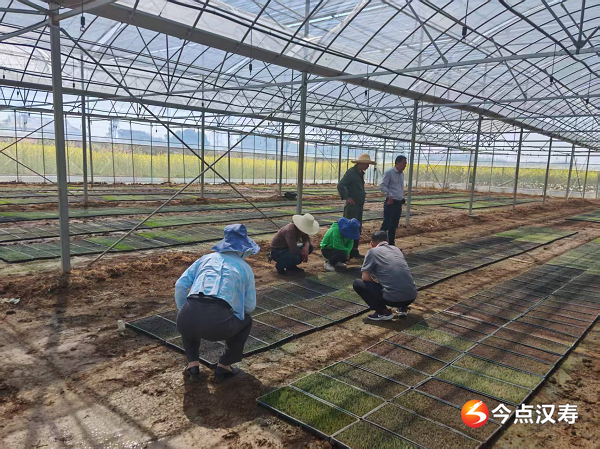 在大棚种植基地,农技专家对学员进行大棚工厂化育秧指导,学员们围成一圈,有的蹲着摸秧苗,有的举着本子记录要点,学习科学选种、合理密植等知识。