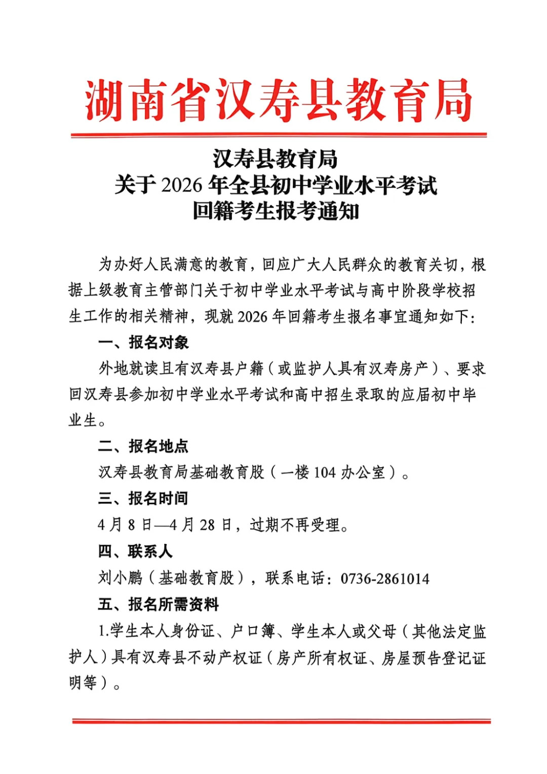 汉寿县教育局 关于2026年全县初中学业水平考试 回籍考生报考通知 为办好人民满意的教育,回应广大人民群众的教育关切,根据上级教育主管部门关于初中学业水平考试与高中阶段学校招生工作的相关精神,现就2026年回籍考生报名事宜通知如下: 一、报名对象 外地就读且有汉寿县户籍(或监护人具有汉寿房产)、要求回汉寿县参加初中学业水平考试和高中招生录取的应届初中毕业生。 二、报名地点 汉寿县教育局基础教育股(一楼104办公室)。 三、报名时间 4月8日—4月28日,过期不再受理。 四、联系人 刘小鹏(基础教育股),联系电话:0736-2861014 五、报名所需资料 1.学生本人身份证、户口簿、学生本人或父母(其他法定监护人)具有汉寿县不动产权证(房产所有权证、房屋预告登记证明等)。 2.学生本人学籍卡证明(加盖就读学校行政公章)。 3.学生本人生物、地理学业水平考试成绩证明(加盖就读学校及县级教育主管部门公章),成绩证明呈现方式为分数的,按分数折算计分;成绩呈现方式为等级的,根据我县对应等级平均分计分。 4.学生本人艺术、综合素质评价结果(加盖就读地学校公章)。 5.学生物理、化学、生物实验操作、信息科技学业水平考试成绩证明(加盖就读地学校公章)。不能提供成绩证明的,以参加汉寿的理化生实验操作考试成绩为准。 6.学生本人近期一寸免冠照片4张及电子照片,用于办理准考证以参加文化科目考试,前期考试考查凭学籍证明参考。 六、考试时间 1.体育与健康测试:5月中下旬,具体时间另行通知。 2.理化生实验操作考试:5月中下旬,具体时间另行通知。 3.艺术科目考试5月下旬,具体时间另行通知。 4.信息科技考试:6月21日至23日(考试形式:上机考试)。 5.文化科目考试:6月18日至20日。 七、注意事项 回籍考生考点学校另行通知,报名与参考的交通、食宿、安全责任由其监护人负责。 汉寿县教育局 2026年4月8日 来 源:汉寿县教育局 编 辑:刘思怡 一 审:刘晓燕 二 审:朱自刚 三 审:张智峰