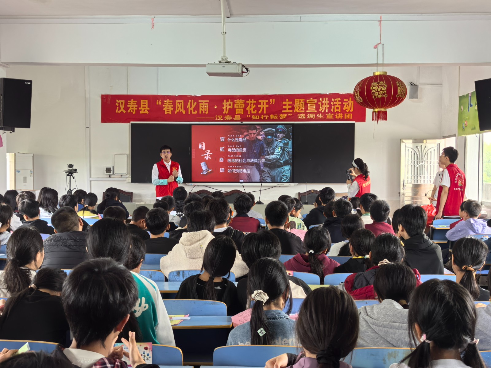 汉寿融媒4月9日讯(通讯员:周蕙媚)4月9日,汉寿县“知行耘梦”选调生宣讲团联合县禁毒办、县司法局工作人员走进蒋家嘴镇中学,围绕禁毒教育与未成年人保护,开展“春风化雨·护蕾花开”主题宣讲活动,用贴近青少年的宣讲方式,为在校学生送上一堂干货满满、意义深刻的法治安全教育课。