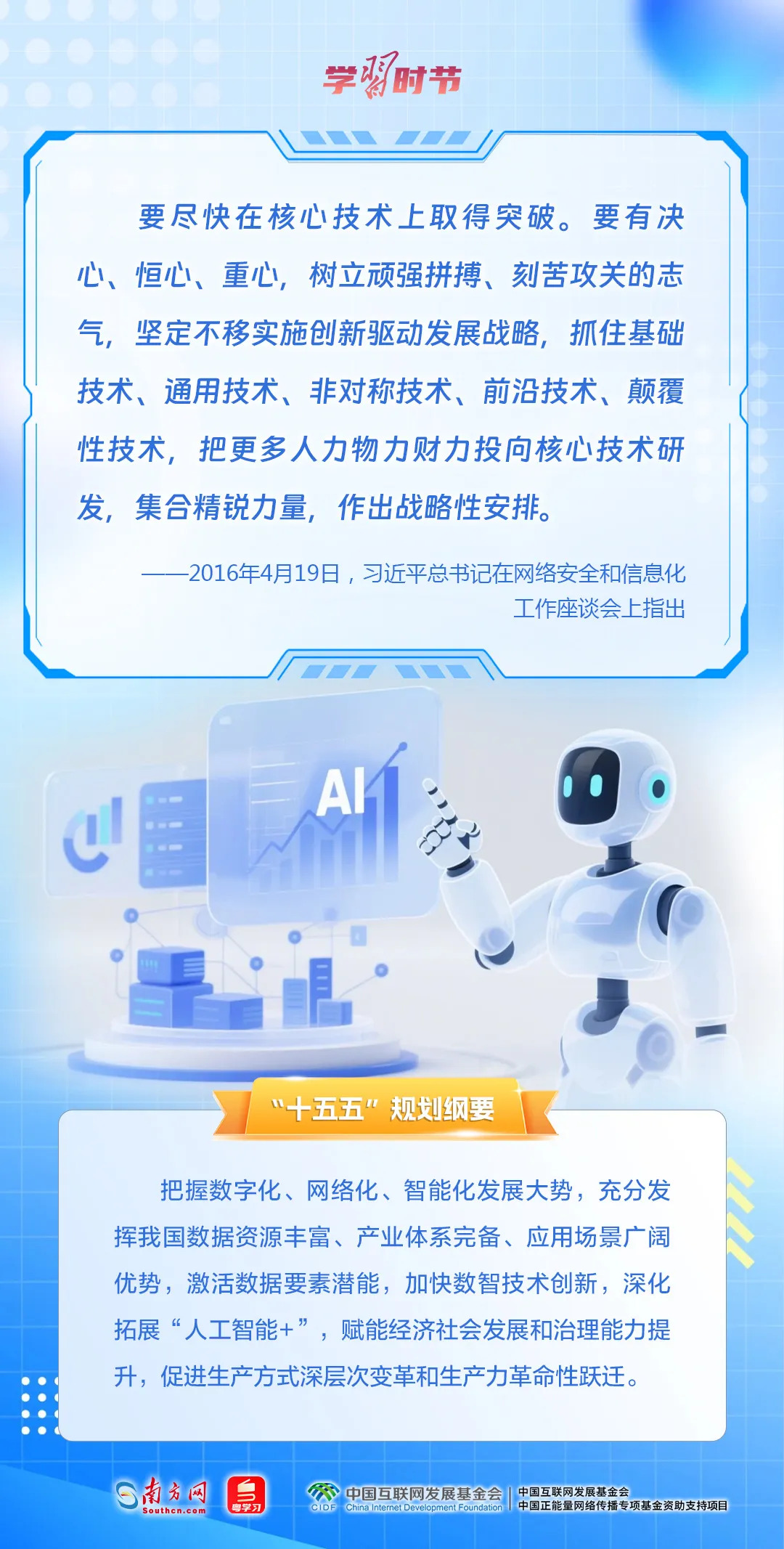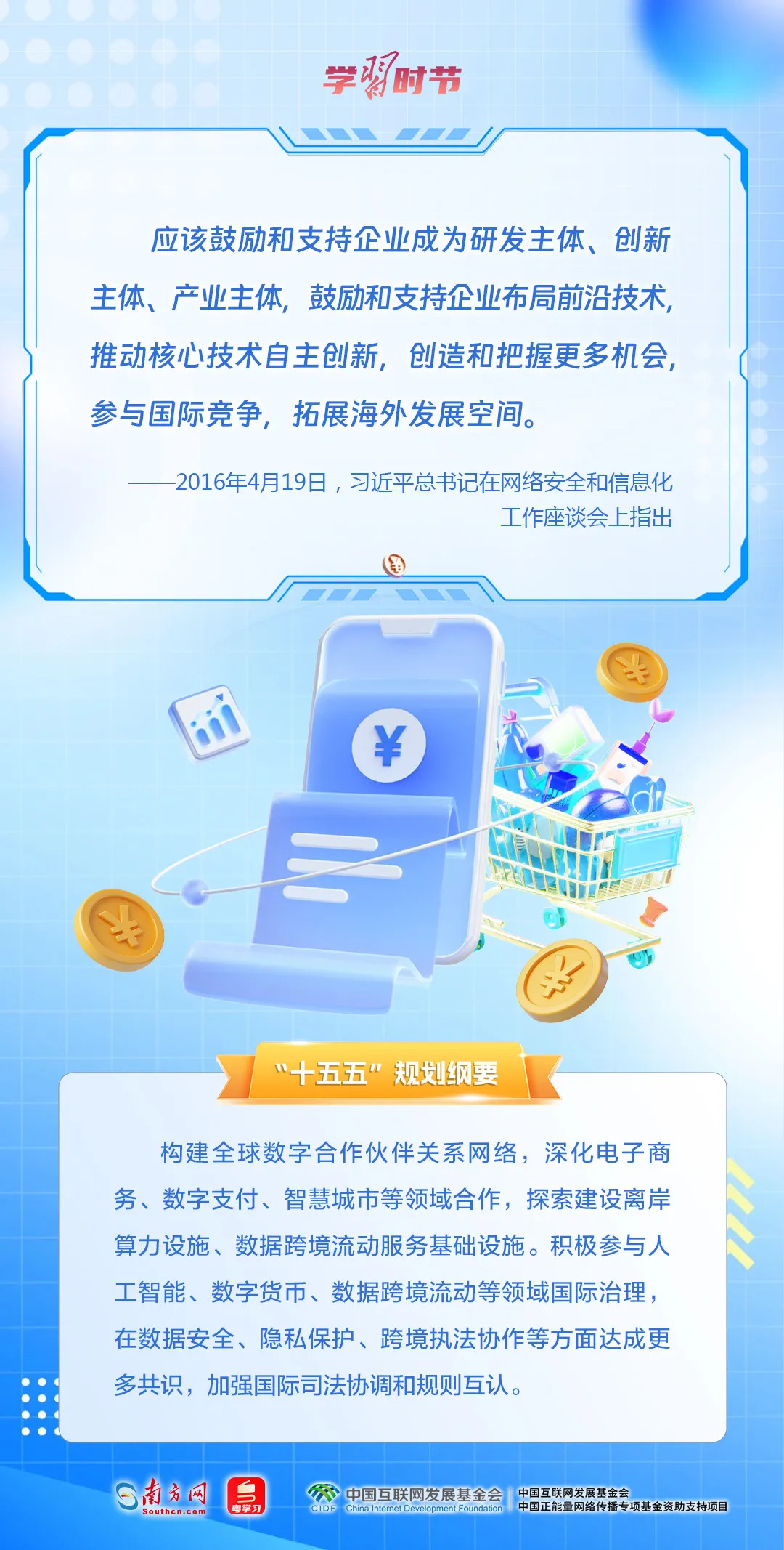 总书记的“4·19”重要讲话是立足中华民族伟大复兴战略全局、世界百年未有之大变局与信息革命时代潮流发生历史性交汇的时代方位做出的深刻阐述,在“十三五”“十四五”时期引领我国网信事业取得巨大成就。“十五五”网信事业怎么干?让我们一同重温习近平总书记“4·19”重要讲话,继续向着网络强国目标阔步迈进。